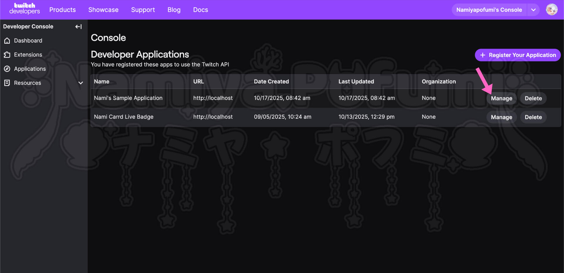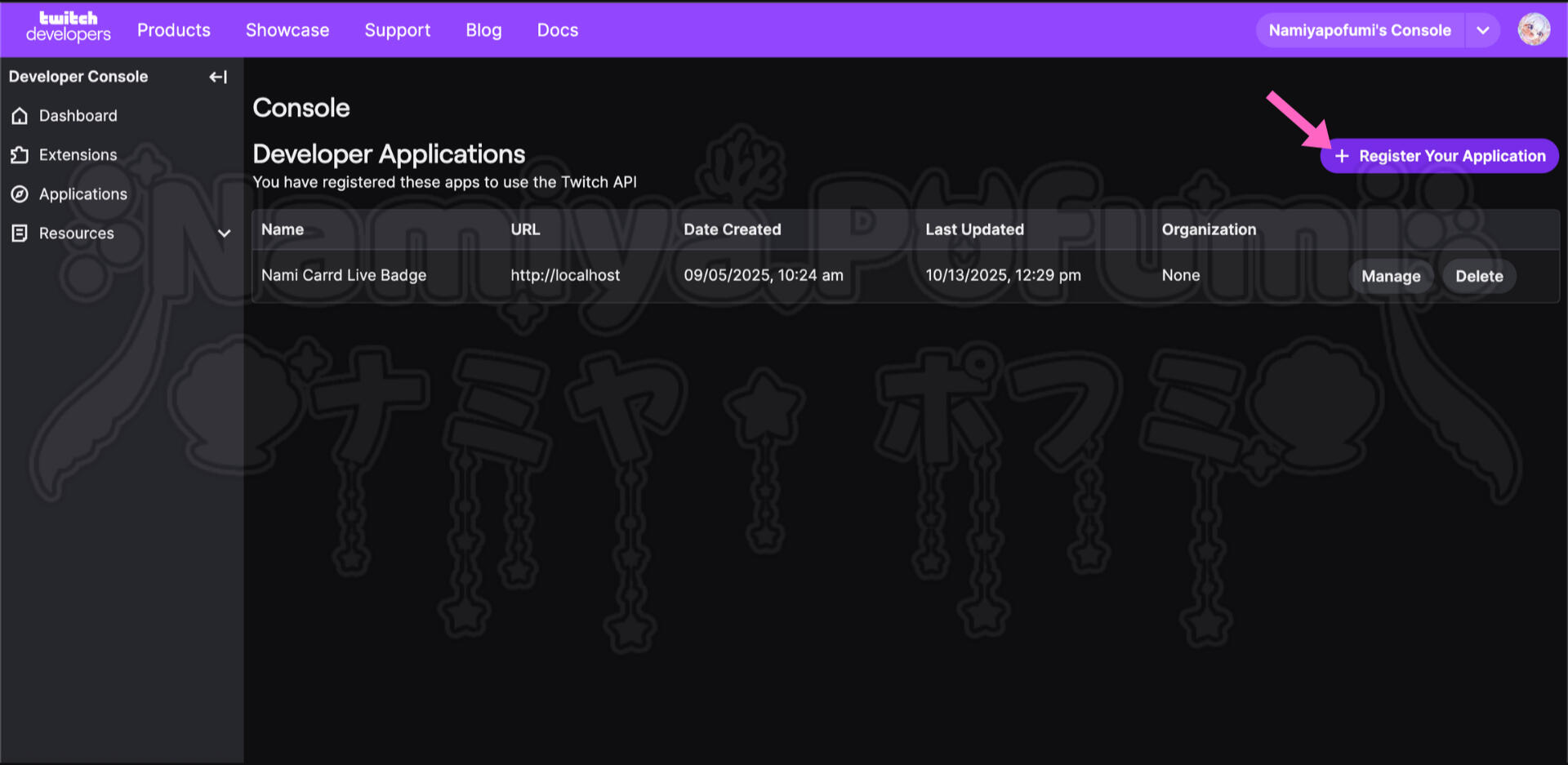 To connect your Twitch channel to the widget, please provide me: 🫧 Twitch Client ID (not client secret) 🫧 Twitch Access TokenStep 1: Create or open your Twitch Application 1) Go to https://dev.twitch.tv/console/apps 2) Sign in with your Twitch account. 3) Click “Register Your Application” (or open an existing one if you already have it).